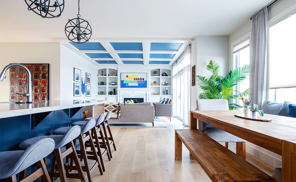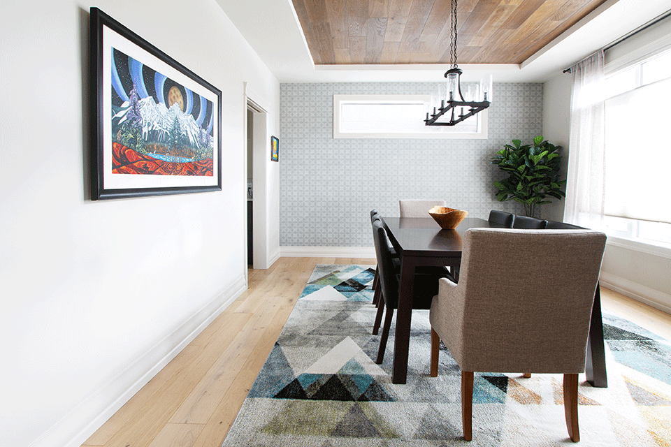 Flooring played a huge role in the dining room specifically. We ended up deciding to use hardwood flooring and insert it into the tray ceiling to create a real sense of earthy richness and give the room immediate interest. Because there was such a strong desire to have those natural elements (both from the mountains and coastal references), we thought this would be the perfect way to create an impact and set the stage as the formal dining room is right off the entrance.